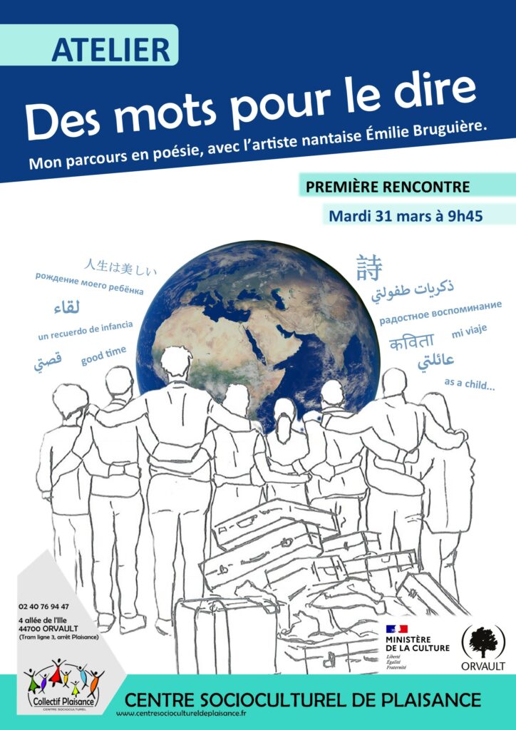 Mon parcours en poésie, avec l’artiste nantaise Émilie Bruguière. Participez à des ateliers d’expression sur votre parcours de vie dans votre langue maternelle et en langue française. Vos mots seront restitués au public par Émilie à travers la création d’un spectacle