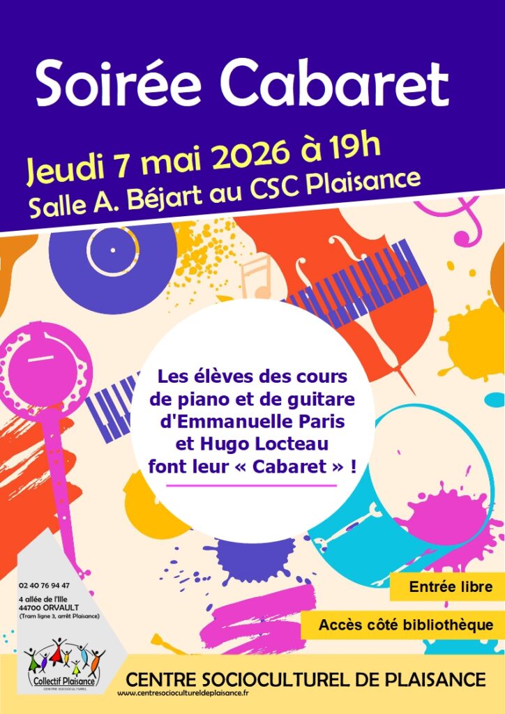 Les élèves des cours de guitare et de piano d’Hugo Locteau et d’Emmanuelle Paris font leur cabaret ! Venez les applaudir le jeudi 7 mai à 19h, salle Armande Béjart au Centre Socioculturel de Plaisance. Entrée libre et gratuite. Venez