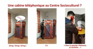 Notre Projet Social fixe les grandes orientations de l’association pour les quatre années à venir. C’est dans ce cadre que nous mettons en place une cabine téléphonique tout à fait spéciale ! Elle permet de récolter la parole des adhérents du Centre Socioculturel et des habitants du quartier Plaisance.